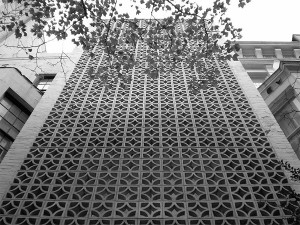 The two major projects that gave Stone renown in his home country were the United States Pavilion at the Exposition Universelle et Internationale in Bruxelles (1958), and the American Embassy in New Delhi (1959). It is here that his experiments with punctured blocks were first given a comprehensive public airing. The motif of the quarter-divided circle in his grillwork became Stone’s signature. It appeared in many of his buildings, unchanged, and much later in a large quantity of suburban front walls in Britain – it is a pattern we should all recognise. Some of his facades, such as student accommodation at the University of South Carolina (1965) and his own house in Manhattan (1958) are almost completely clad in this same patterned block. Hunting cites this as one of the reasons for Stone’s critical demise: his attempt to create a recognizable architectural brand came with the dire risk of self-pastiche.